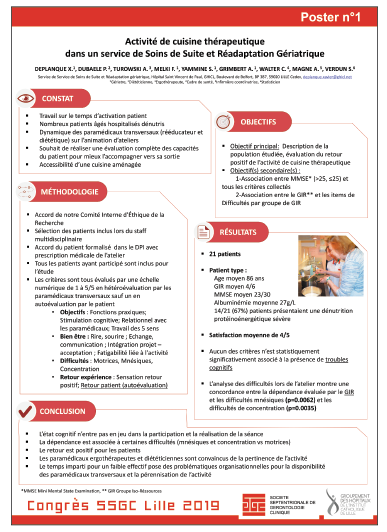 Le plaisir de la table est de tous les âges. Cependant, les personnes âgées entretiennent un rapport parfois complexe à l’alimentation. La perte d’autonomie, certaines pathologies ou encore la solitude peuvent notamment perturber les prises alimentaires. Pourtant, leurs besoins nutritionnels augmentent, et cette inadéquation entre les apports et les besoins entretient la spirale infernale de la dénutrition. Depuis ce début d’année 2019, la culinothérapie a vu le jour au sein du Service de soins de suite et réadaptation gériatrique de l’Hôpital Saint-Vincent-de-Paul. Tous les 15 jours, un groupe de patients est encadré par un binôme diététicienne/ergothérapeute. L’axe nutritionnel est développé, les besoins du patient sont identifiés, et des conseils adaptés sont délivrés au regard des recommandations médicales. Cet atelier est un dispositif de rééducation permettant de réapprendre des automatismes oubliés, et de travailler la motricité en stimulant de façon ludique et divertissante la mémoire. L’objectif global de cet atelier est de réaliser une évaluation complète des capacités du patient pour mieux l’accompagner vers sa sortie. Les patients inclus sont ceux qui ont accepté de participer après avoir été sélectionnés lors du staff multidisciplinaire. Vingt-et-un patients d’âge moyen de 86 ans ont bénéficié de l’activité (GIR moyen : 4/6, MMSE moyen : 23/30). L’albuminémie moyenne est de 27 g/l. Quatorze des 21 patients présentaient une dénutrition protéino-énergétique sévère. Les critères sont évalués par une échelle numérique : objectifs, bien-être, difficultés (motrices, mnésiques, concentration), satisfaction de la séance. Aucun des critères n’est statistiquement significativement associé à la présence de troubles cognitifs. L’analyse des difficultés lors de l’atelier montre une concordance entre la dépendance évaluée par le GIR et les difficultés mnésiques (p = 0,0062) et de concentration (p = 0,0035). L’activité est positive pour les patients, leur satisfaction moyenne est de 4/5. Toutefois, le temps imparti pour un faible effectif pose des problématiques organisationnelles.
