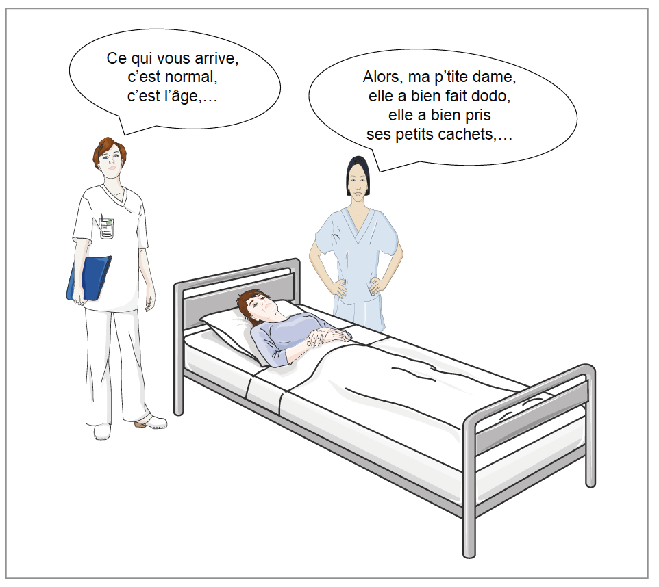 Ce type d’âgisme se manifeste au quotidien, dans les relations familiales, amicales ou professionnelles. Il commence dès l’enfance, à travers les stéréotypes que les enfants assimilent de leur environnement, notamment par les livres, films, dessins animés et autres supports conçus pour eux. Ces représentations mettent principalement l’accent sur les aspects négatifs et caricaturaux du vieillissement, présentant souvent l’âge comme un déclin inévitable des capacités physiques et mentales, ainsi qu’une période de dépendance. Un passage tiré du livre pour enfants de Roald Dahl, La potion magique de Georges Bouillon, illustre bien cet “endoctrinement” des enfants aux stéréotypes et préjugés à l’encontre des personnes âgées : « La plupart des grand-mères sont d’adorables vieilles dames, gentilles et serviables, mais pas celle-là. Elle passait sa journée, toutes ses journées, assise dans son fauteuil, près de la fenêtre, et elle était tout le temps en train de se plaindre, de bougonner, de ronchonner, de râler et de pester sur tout et sur rien. » Ces stéréotypes, qu’ils soient conscients ou non, persistent souvent jusqu’à l’adolescence et à l’âge adulte, contribuant à la construction d’une hiérarchie psychologique défavorable aux personnes âgées et alimentant ainsi l’âgisme institutionnel. L’âgisme interpersonnel peut se manifester par un langage infantilisant, des décisions imposées (« Laisse, tu es trop vieux pour ça ») ou des propos condescendants (Fig. 1). Ces comportements nuisent à l’estime de soi et renforcent l’isolement des seniors.