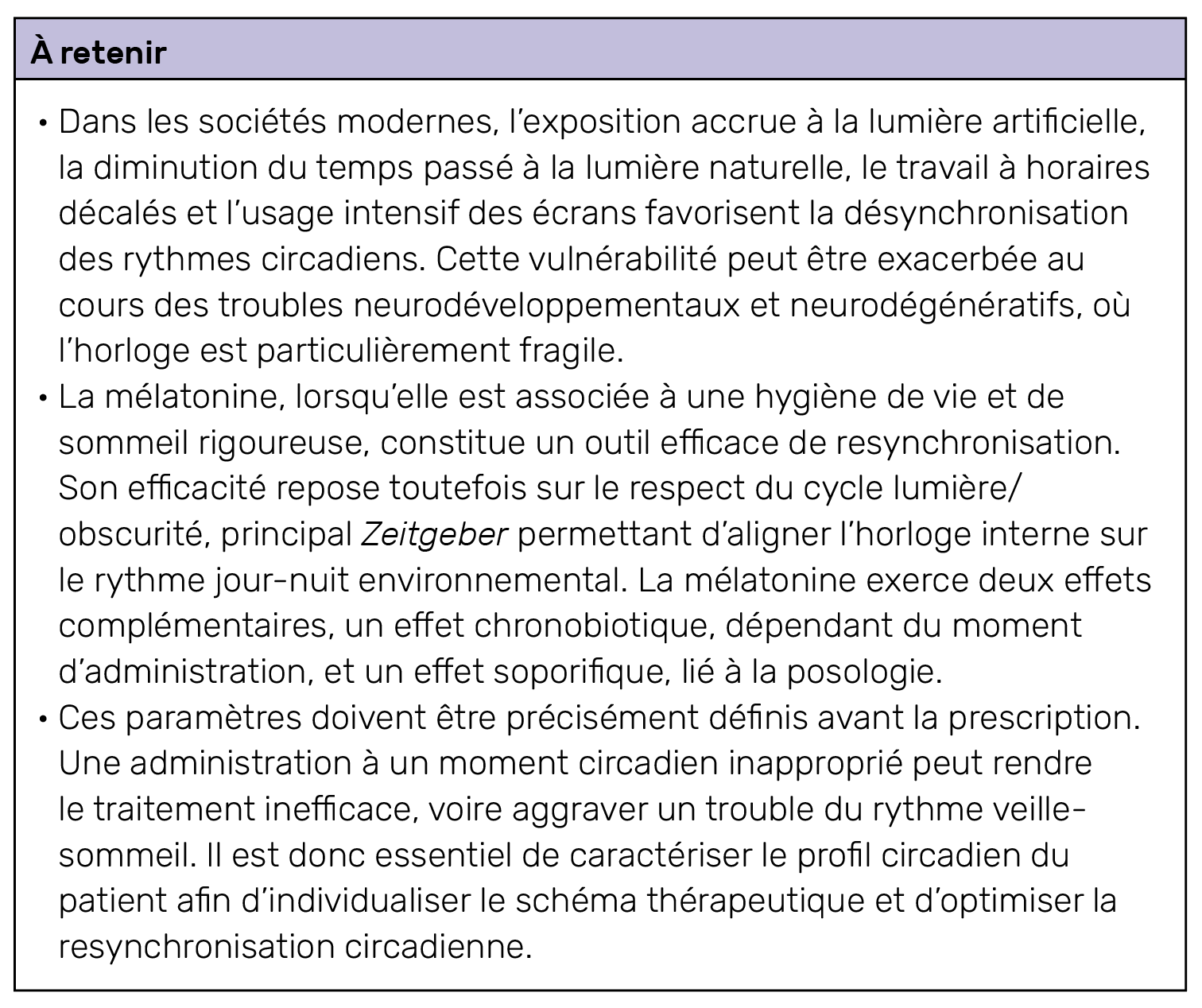 Le moment d’administration de ces mesures est déterminant pour restaurer une synchronisation efficace du rythme veille-sommeil.