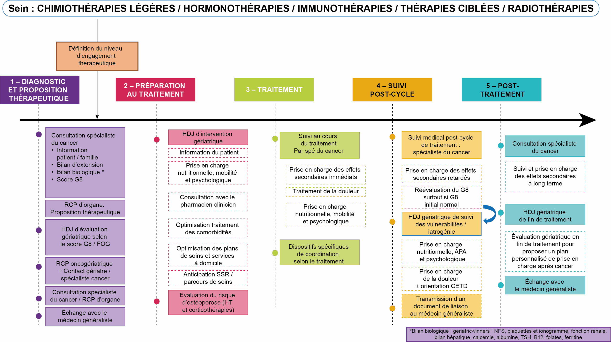 • le moment et la nature de l’intervention des différents professionnels impliqués dans les dimensions de soin ont été précisés à cinq étapes clés du parcours :